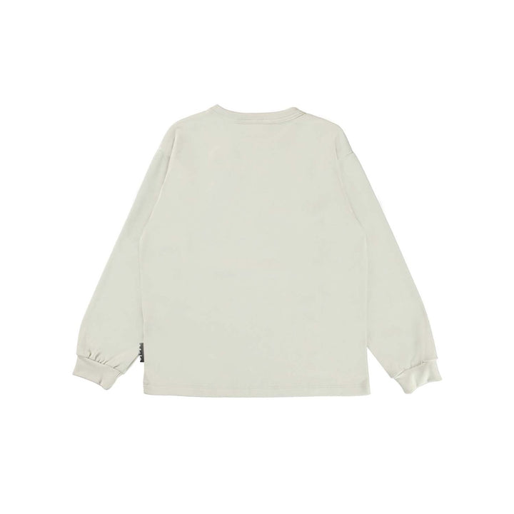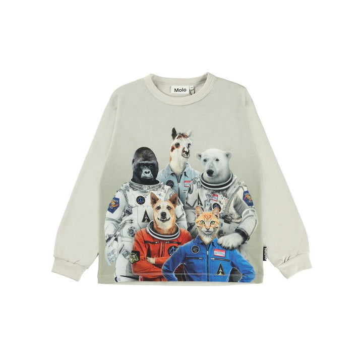 Super fun White Sweatshirt for boys by Molo, made in soft organic cotton jersey. A staple of the brand's style, it has a cute animal astronaut print on the front and a black logo tab on the side seam.