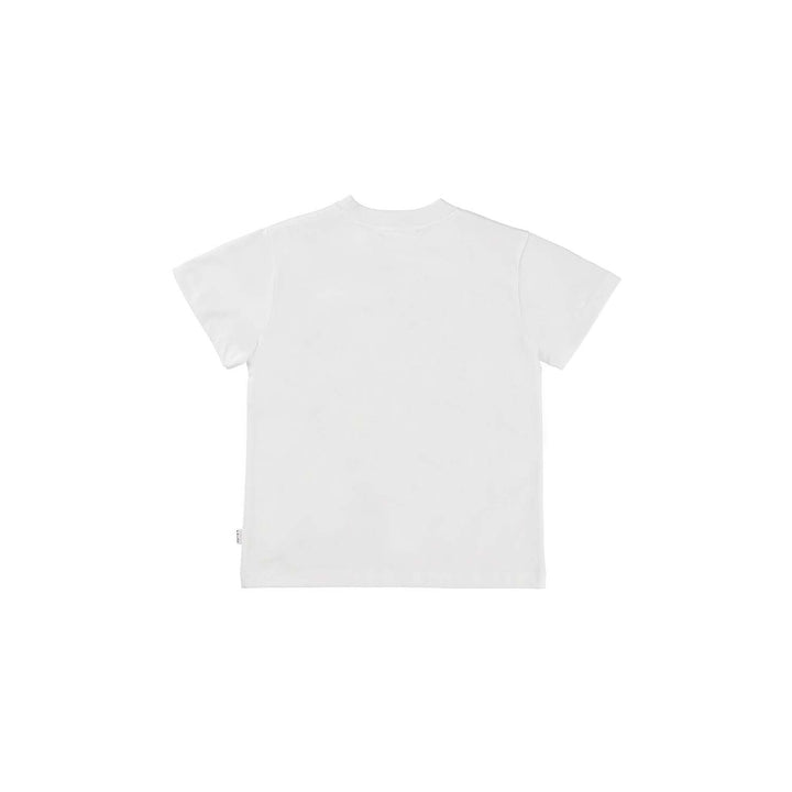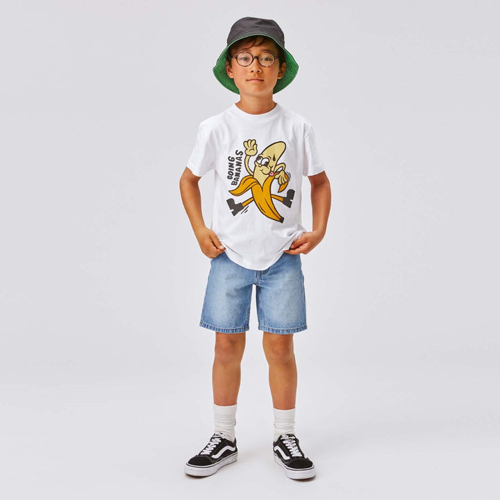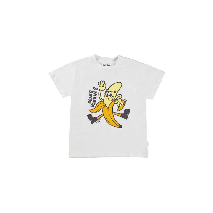 A fun white T-shirt for boys and girls by Danish brand Molo, made in soft organic cotton jersey. Full of character, this crew neck T-shirt has a raised banana print on the front, along with a 'Going Bananas' slogan.