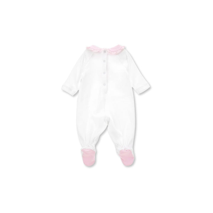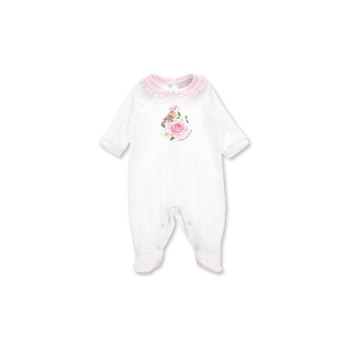 The white baby outfit from Monnalisa is designed for the tiniest romper,This adorable ensemble features a pink collar and pink footies. On the chest, there is a depiction of a pink rose with a little bird, adding a sweet and charming touch to this cute garment.