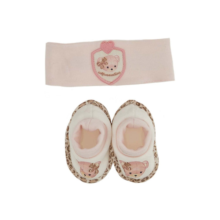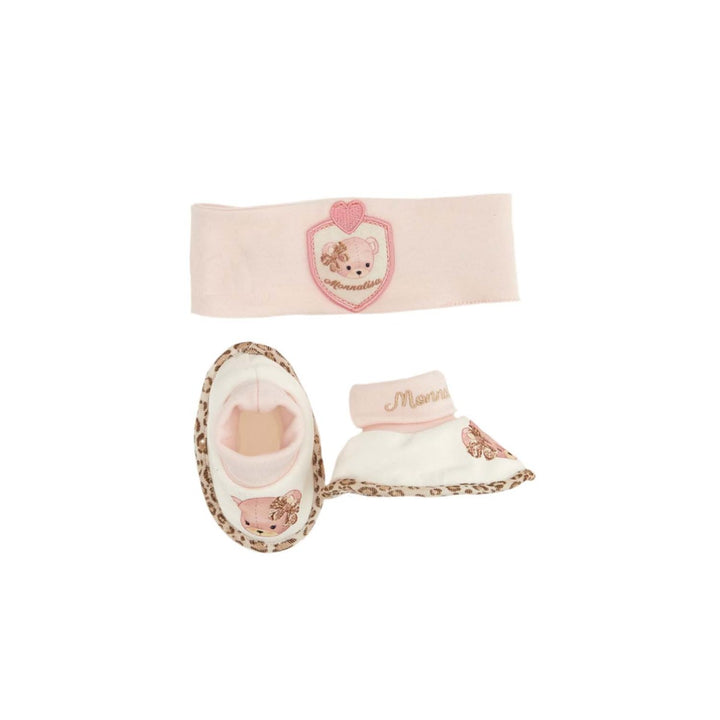 Pink shoes baby girl Monnalisa Kids. Front logo embroidery, teddy bear print, elasticated ankle hems, round toe and flat sole. Cotton 100%