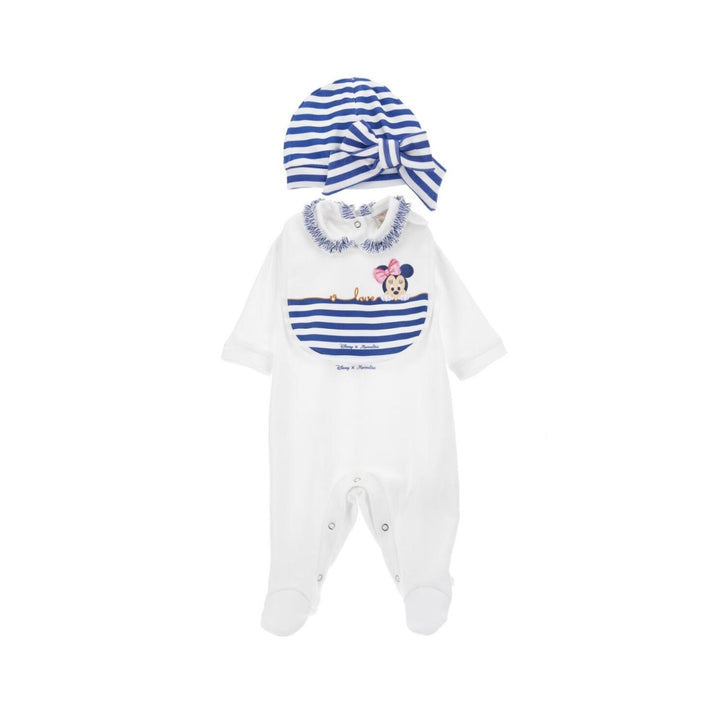 Newborn set consisting of one-piece suit, striped bib and jersey cap.