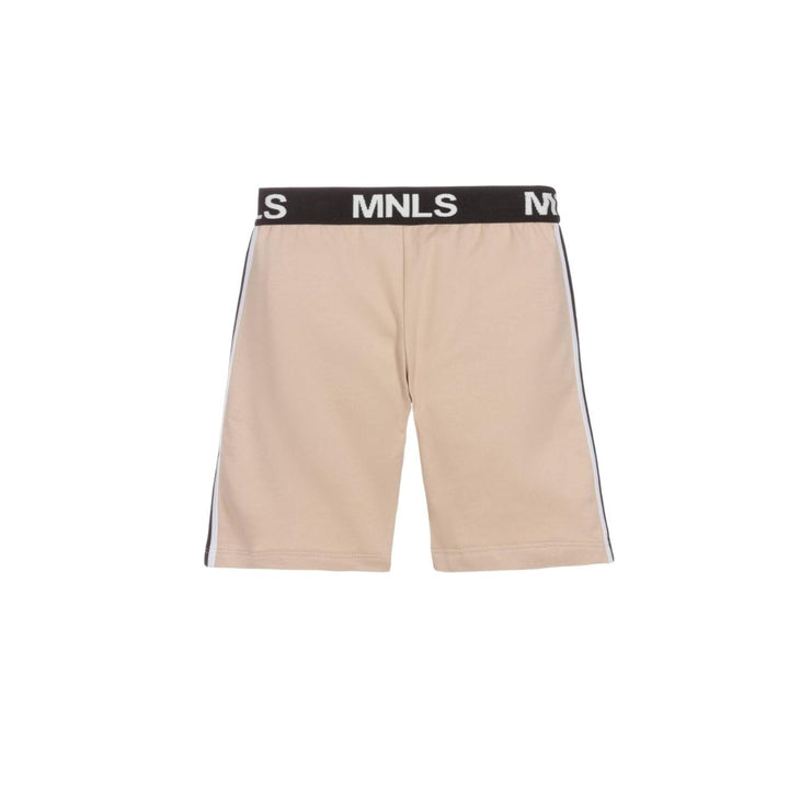 A casual pair of beige shorts for boys by Monnalisa, made from luxuriously soft cotton jersey. Cool and comfortable, they feature a bold elasticated logo waistband, with decorative detailing on the front. The pockets, lined in a polka dot pattern, and monochromatic logo taping add style to this piece.