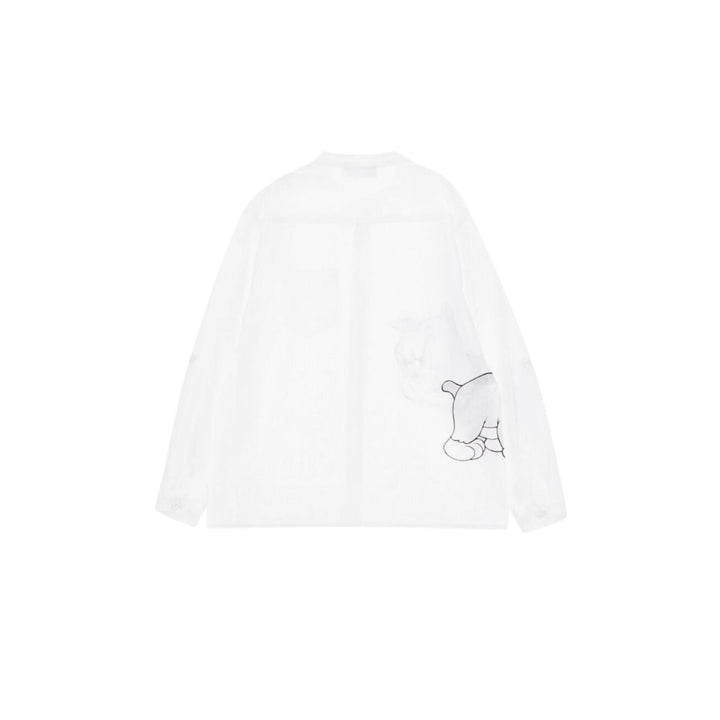 This white mandarin shirt has a fun sketched WB character.