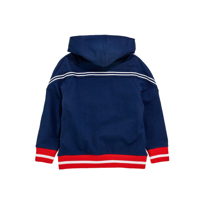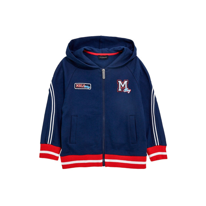 Brushed fleece with coloured bands Hoddie for boys by Monnalisa .Practical for every-day wear, the sporty garment par excellence, the open hooded sweatshirt with bands.