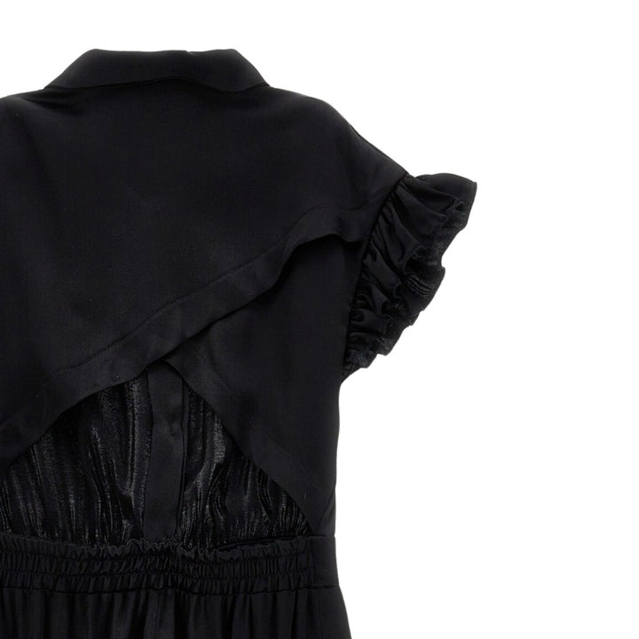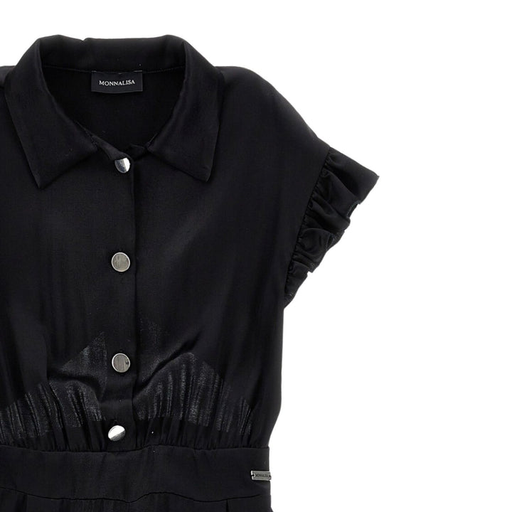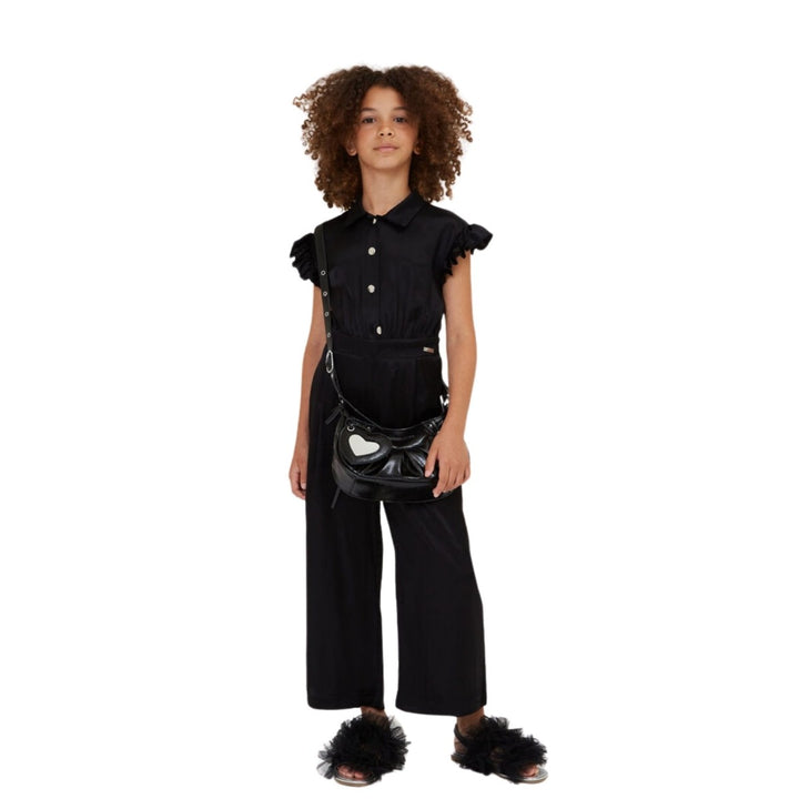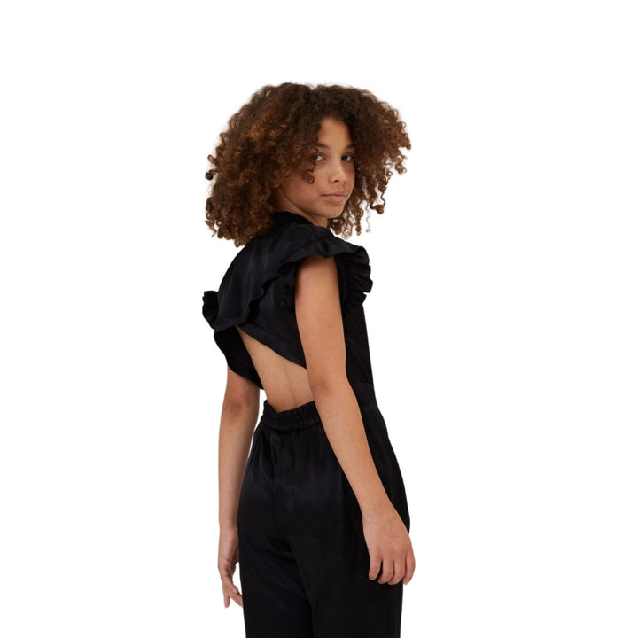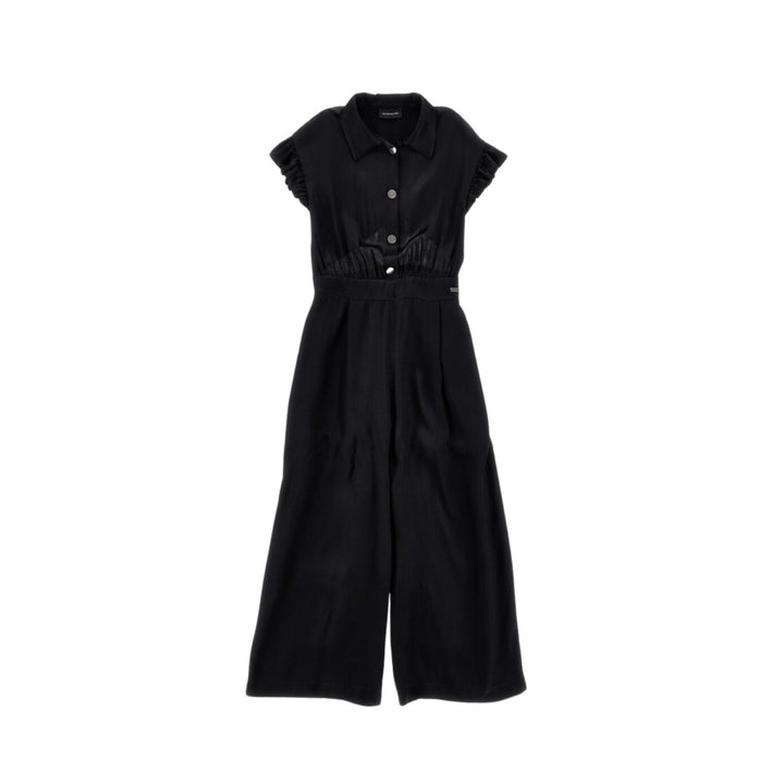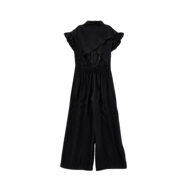 Girls black supple viscose jumpsuit with pointed collar, metal buttons, elastic at the waist and cross back with cut out.