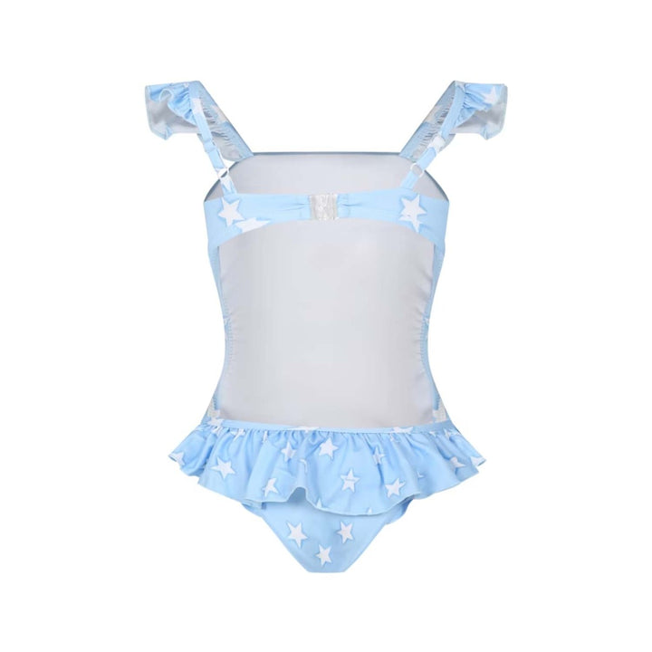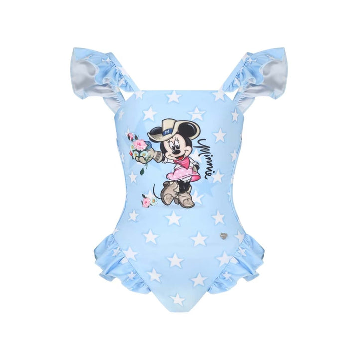 A blue ruffle-trimmed swimsuit for girls by Italian label Monnalisa, made in silky, stretchy fabric and fully lined. So sweet and feminine, it is designed with Disney's loveable Minnie Mouse wearing a cowgirl costume, adding a little Wild West style to an outfit. Colourful floral, star and chilli pepper prints add vibrance to this cute design. Fastening with an easy-securing clip on the back, it has adjustable shoulder straps for the best fit and a stylish open-back detail.