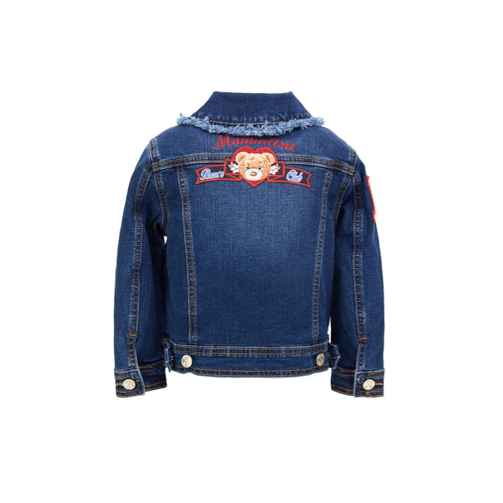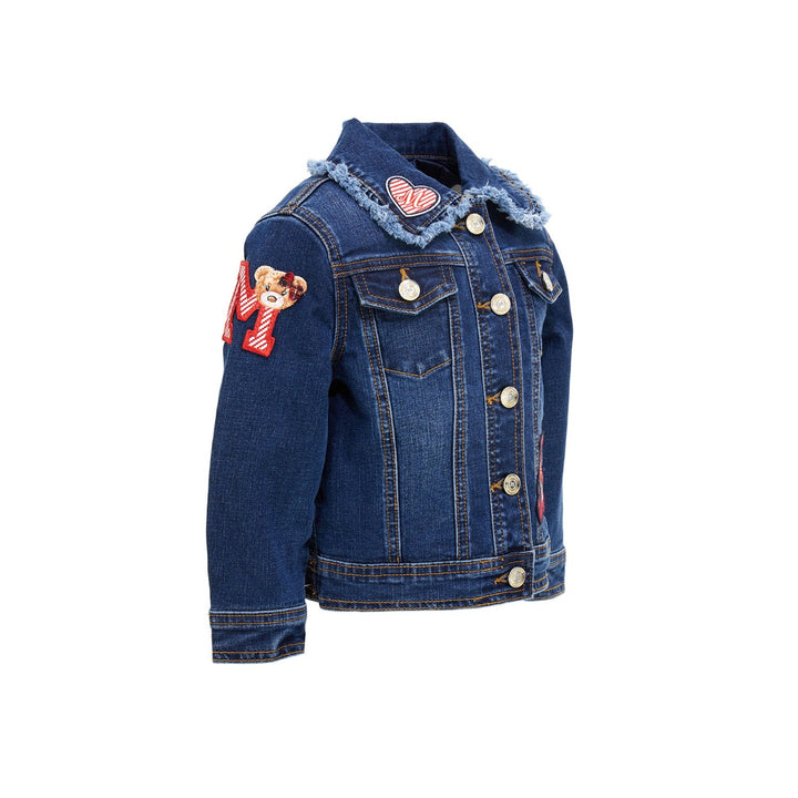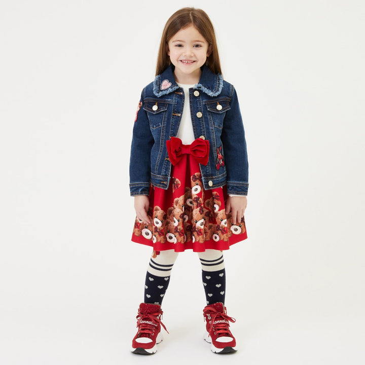 Chic lighter wash blue denim jacket for girls by Monnalisa, with various red teddy and logo appliqu챕s throughout. A great layering piece, this stylish jacket has a frayed collar and shiny gold logo buttons. The silky satin lining means comfort is not compromised for the sake of style.