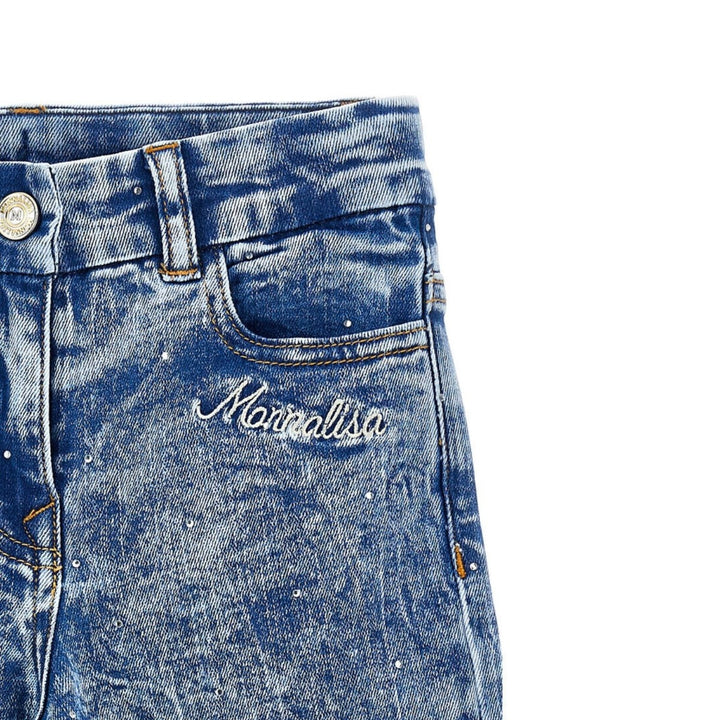 Fabulous wide-leg denim jeans for girls by Monnalisa, with an edgy blue stonewash design. Signed with champagne gold logo embroidery below the front pocket, these cool trousers are decorated with diamanté studs for that all-important sparkle. They have a gold-tone front button and zip fastening, a gold-glitter resin and metal logo patch on the back, and boho fraying on the hem. An adjustable waistband ensures a comfortable fit.