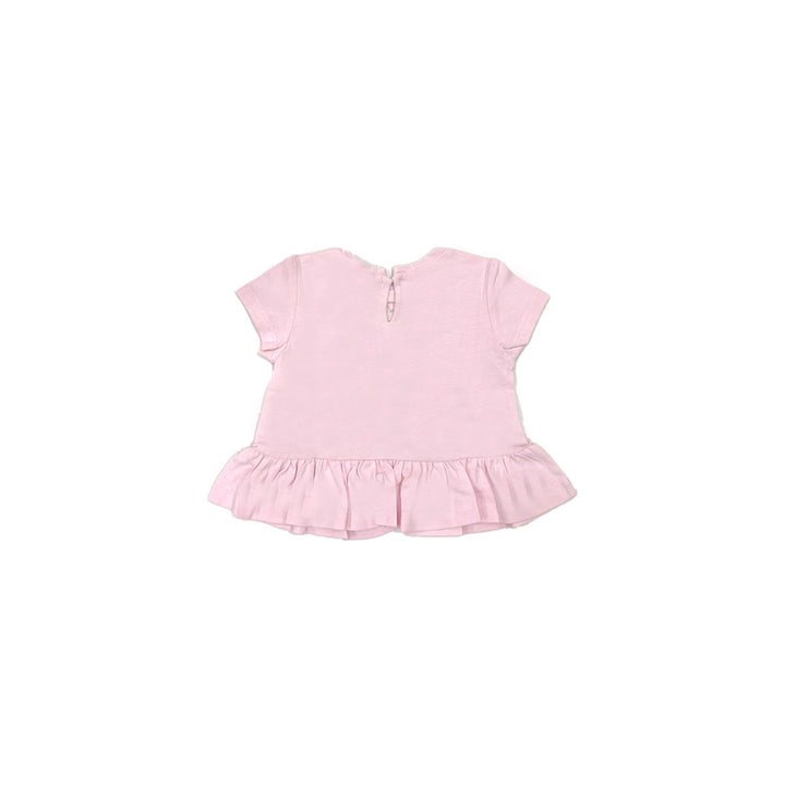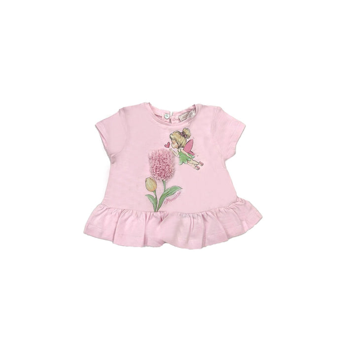 fairy-print peplum T-shirt from MONNALISA featuring Pink, cotton, jersey knit, graphic print to the front, applique detail, peplum hem, keyhole detail to the rear, crew neck and short sleeves.