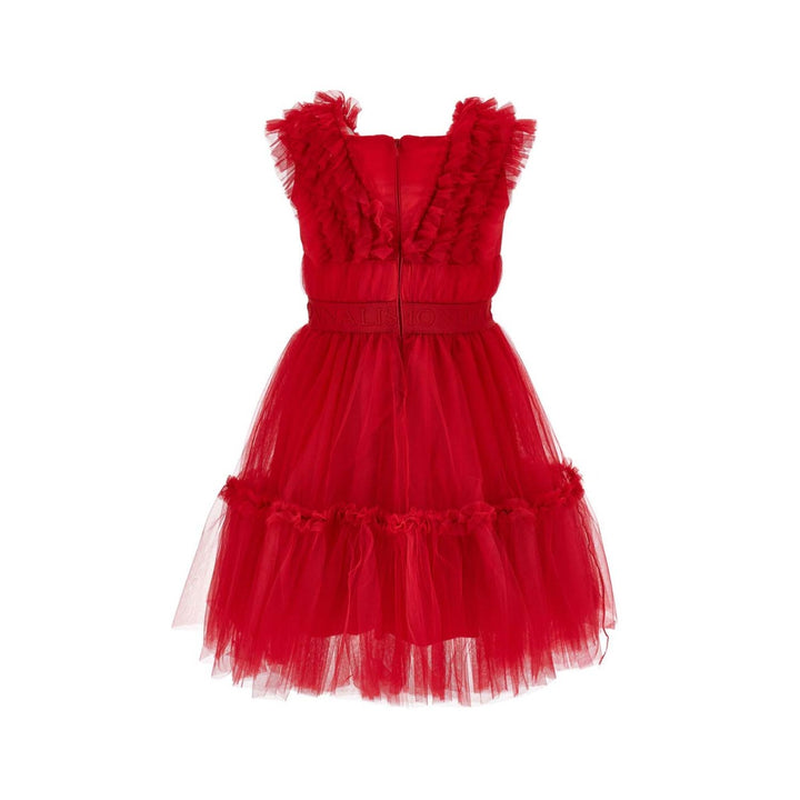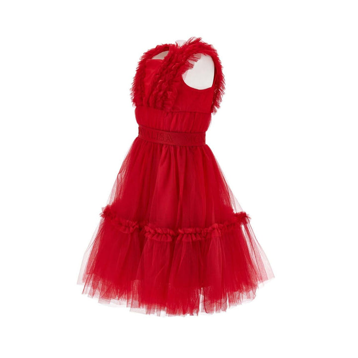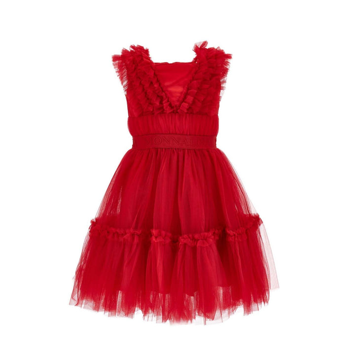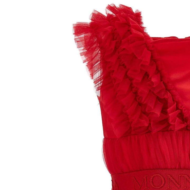 In a stunning shade of red , this special occasion dress for girls is designed by Italian brand, Monnalisa. Crafted in beautifully soft layers of fine tulle, it has a fitted bodice with luxurious, statement ruffles. Around the waist is a jacquard logo sash for a discreet, designer detail. The tiered skirt is lined with layers of tulle to add dramatic volume and create a silhouette with feminine flair. Seamlessly fastening with a concealed zip on the back, the dress is lined in cotton voile for comfort.