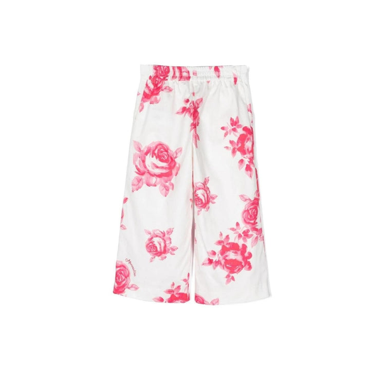 all-over rose-print trousers from MONNALISA featuring all-over rose print, elasticated waistband, belt loops, front button and zip fastening, two side inset pockets, white-pink and cotton.
