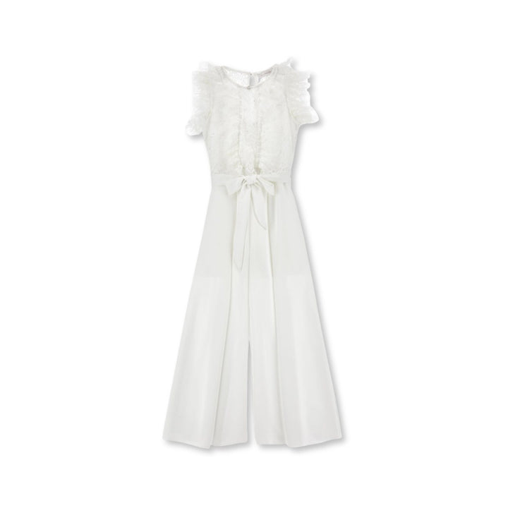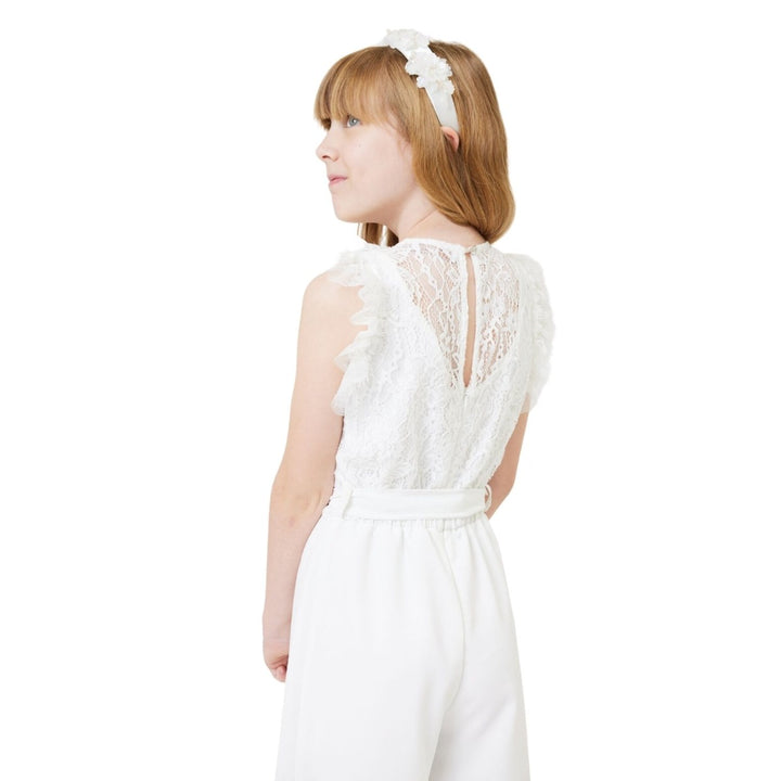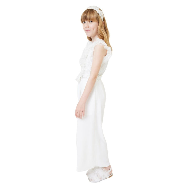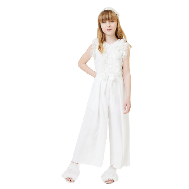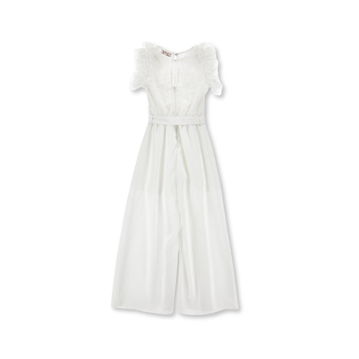 Girls white elegant satin jumpsuit with darts, slanted pockets, teardrop fastening on the back and invisible zip and lace bodice with sequins and jabot.