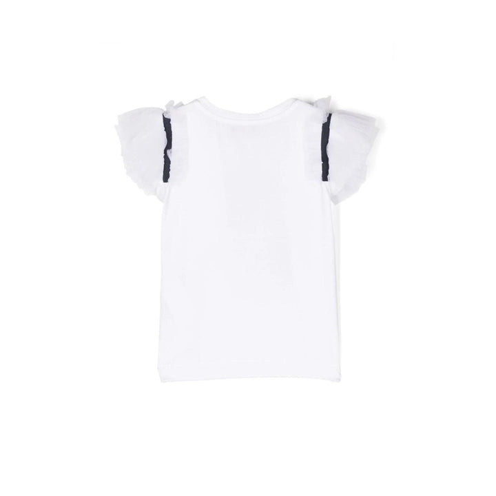 graphic-print tulle-sleeve T-shirt from MONNALISA featuring white-multicolour, stretch-cotton, graphic print to the front, logo print to the front, round neck, tulle sleeves and straight hem.