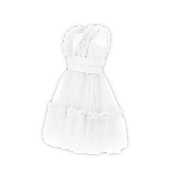 In a stunning shade white, this special occasion dress for girls is designed by Italian brand, Monnalisa. Crafted in beautifully soft layers of fine tulle, it has a fitted bodice with luxurious, statement ruffles. Around the waist is a jacquard logo sash for a discreet, designer detail. The tiered skirt is lined with layers of tulle to add dramatic volume and create a silhouette with feminine flair. Seamlessly fastening with a concealed zip on the back, the dress is lined in cotton voile for comfort.