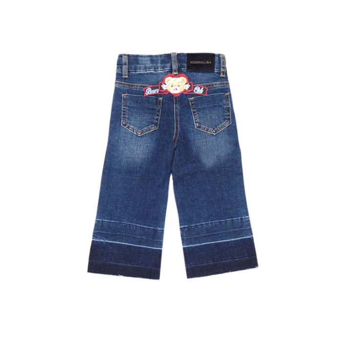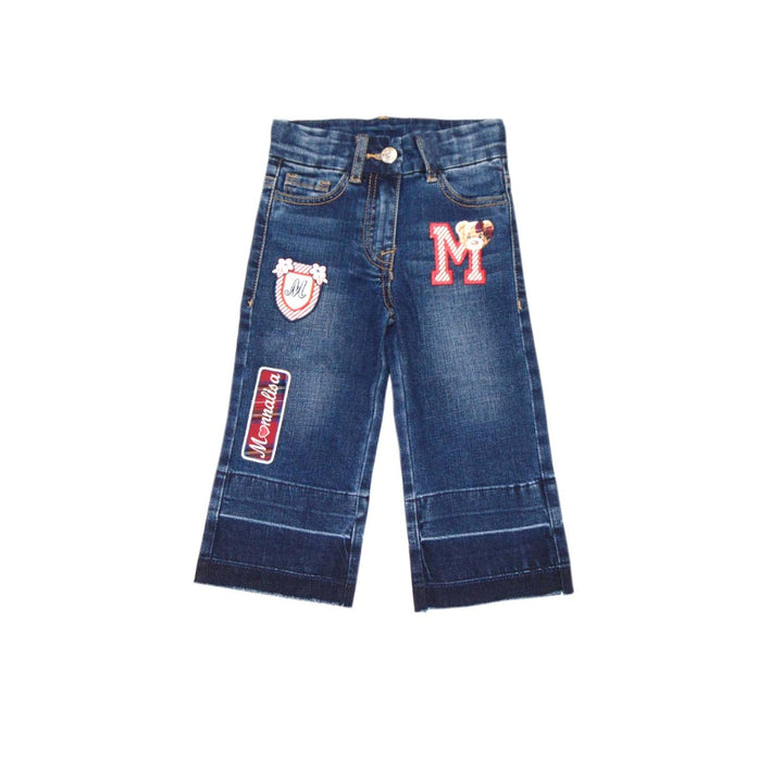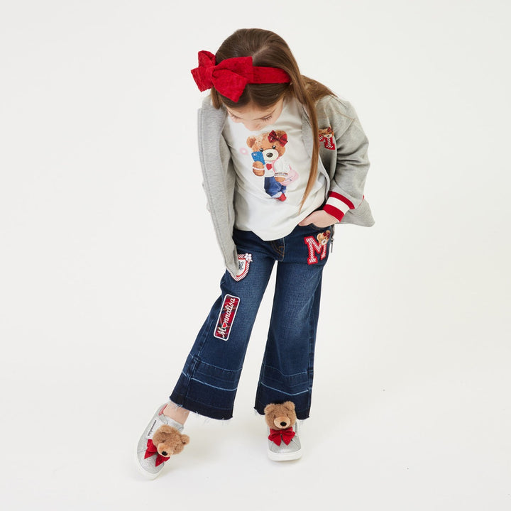 Dark blue wash denim jeans for girls from Monnalisa, with fun varsity logo and teddy bear appliqu챕s. A blue velvet patch on the back has the brand name in rubberised gold for an elegant touch to the classic five pocket style. Cool and comfortable, they have a wide leg cut and darker panels at the bottom with frayed hems.