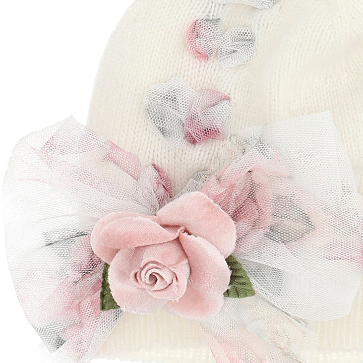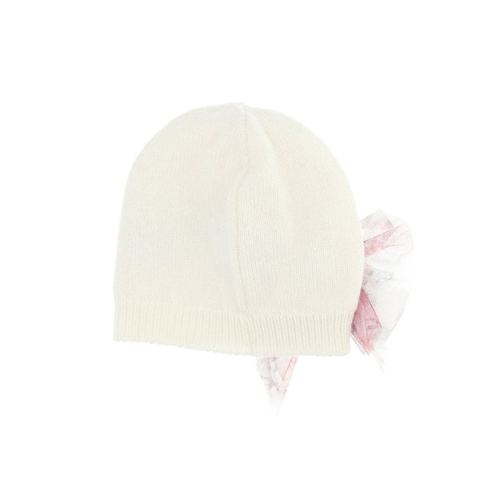 White hat baby girl Monnalisa Kids. Knitted design, bow detail, floral appliqué, logo charm and ribbed hem. Polyester 100%, Virgin Wool 50%, Acrylic 50%