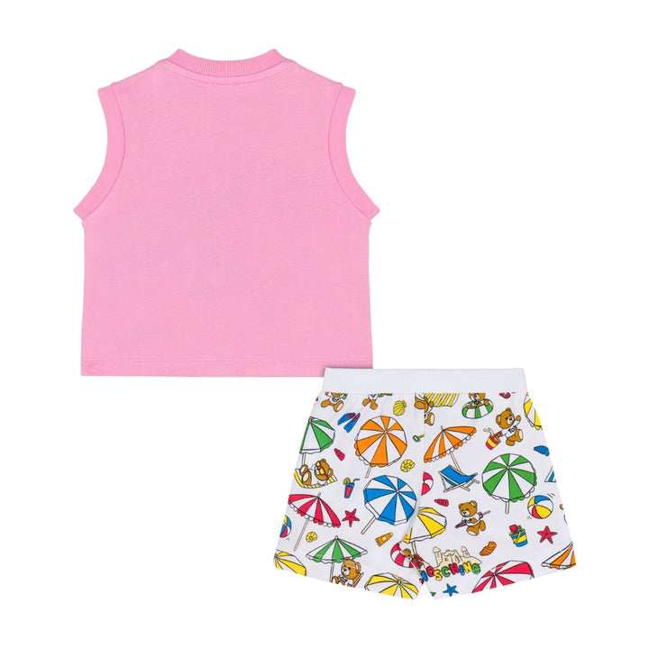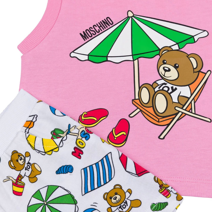 Baby girls pink and white shorts set by Moschino. Made from soft premium cotton jersey, this set consists of blue sleeveless top with the brands iconic teddy bear under the umbrella and logo print on the front. Fastens with poppers on one shoulder, matching white shorts with all-over colourful umbrella, teddy bear and logo print. They have side pockets and finished with an elasticated waistband for comfortable fit.