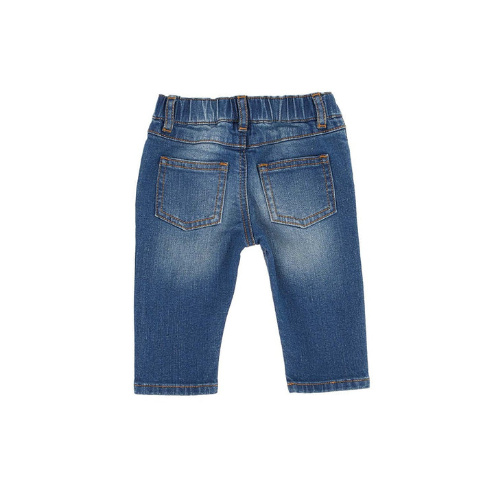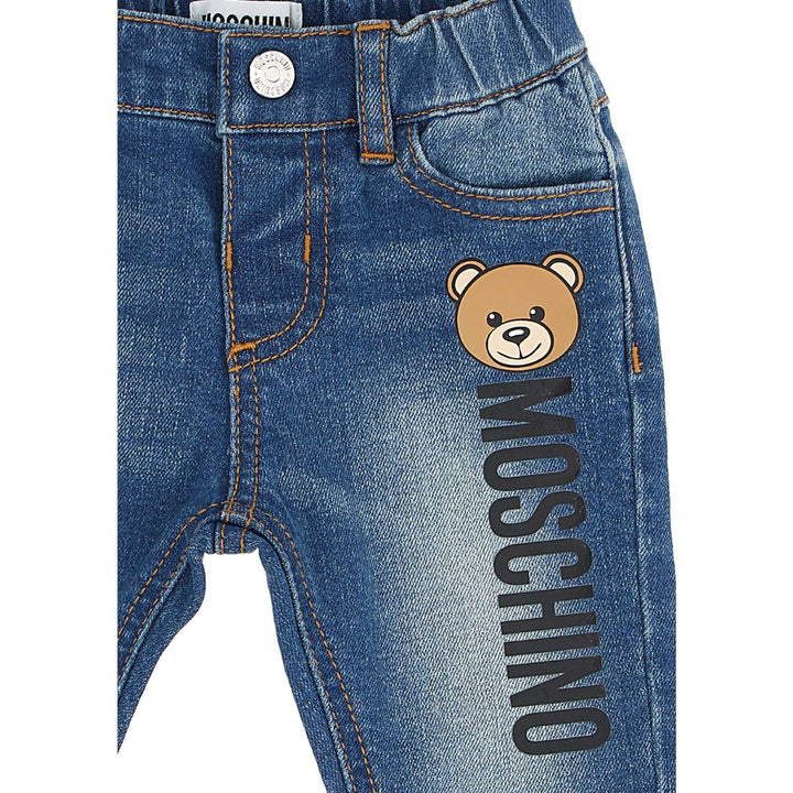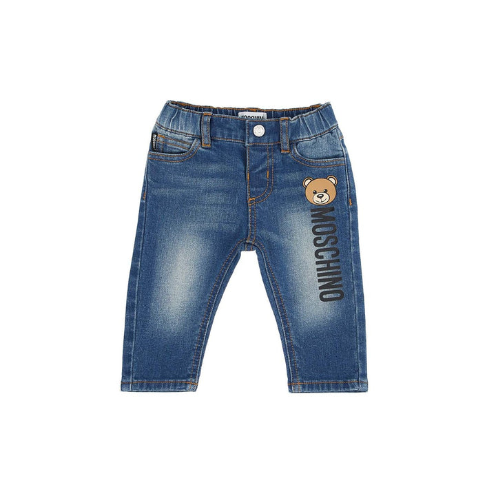 logo-print straight-leg jeans from MOSCHINO KIDS featuring blue, stretch-cotton, contrast stitching, signature Teddy Bear motif, logo print at the leg, front button fastening, long length, straight leg and classic five pockets.