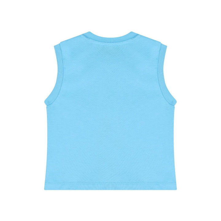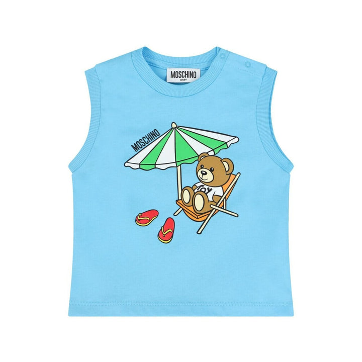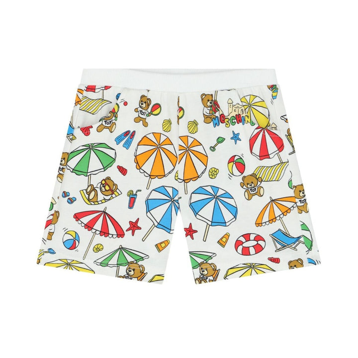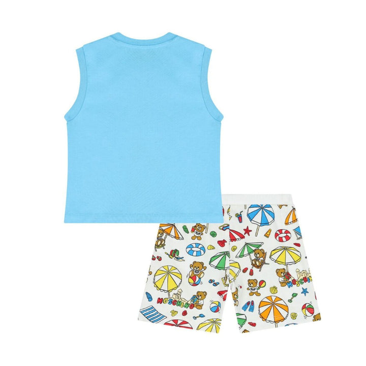 Unisex blue and white shorts set for baby boys and girls by Moschino. Made from soft premium cotton jersey, this set consists of blue sleeveless top with the brands iconic teddy bear under the umbrella and logo print on the front. Fastens with poppers on one shoulder, matching white shorts with all-over colourful umbrella, teddy bear and logo print. They have side pockets and finished with an elasticated waistband for comfortable fit.