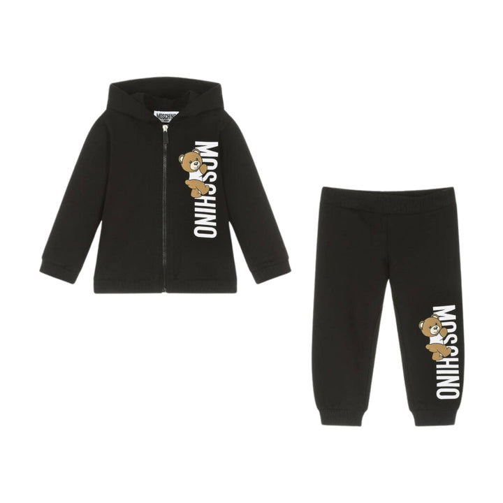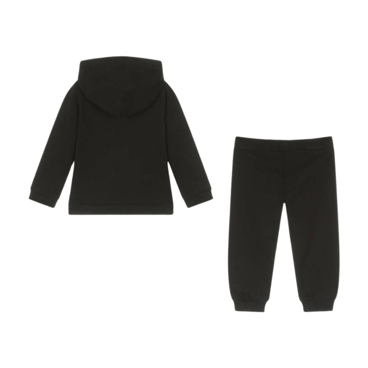 Black tracksuit for little boys and girls by Moschino Baby, made from mid-weight cotton jersey with added stretch. Layered over T-shirts, the zip-up hoodie has recognisable white lettering and the Moschino Teddy Bear printed on the front. The matching joggers, also printed with the label's iconic mascot, have an elasticated waist and stretchy ribbed cuffs for total comfort.