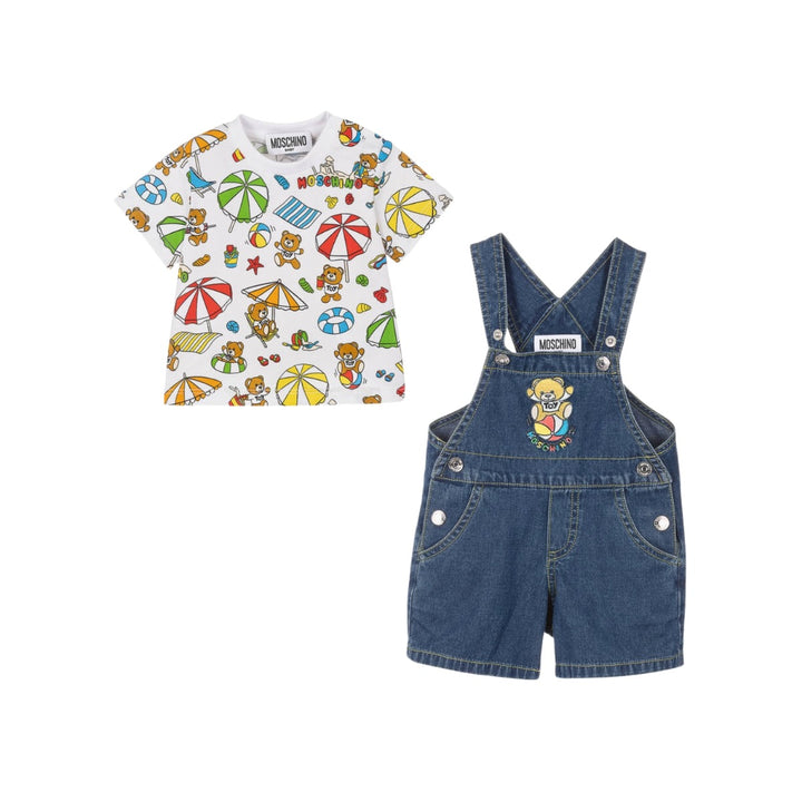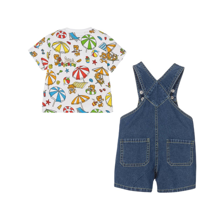 Super cute blue cotton dungaree shorts set for little boys and girls by luxury Italian brand Moschino Baby. The short-sleeved, white T-shirt has a colourful print of the iconic Moschino Teddy Bear on holiday, and is made in comfortable jersey. It has popper fastenings on one shoulder to help with dressing and a ribbed neckline. The lightweight denim dungarees have the signature bear embroidered on the bib, bouncing on a colourful ball. They fasten with silver logo poppers on the sides, have useful, adjustable shoulder straps and pockets on both the front and back.