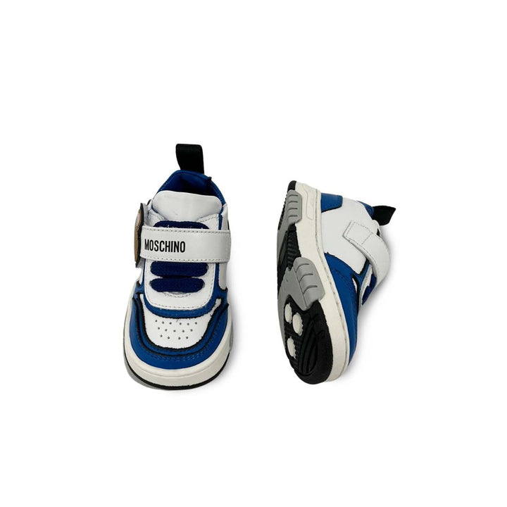 Funky blue and white leather trainers for teen boys by Moschino Kid-Teen. Lace up with black lace, the additional velcro strap features a black logo print and the fun Moschino Teddy Bear patch in a super soft silicone bristle texture for added playful element. With soft leather lining and gently padded insole for comfort, they have a tri-colour rubber sole for better grip.
