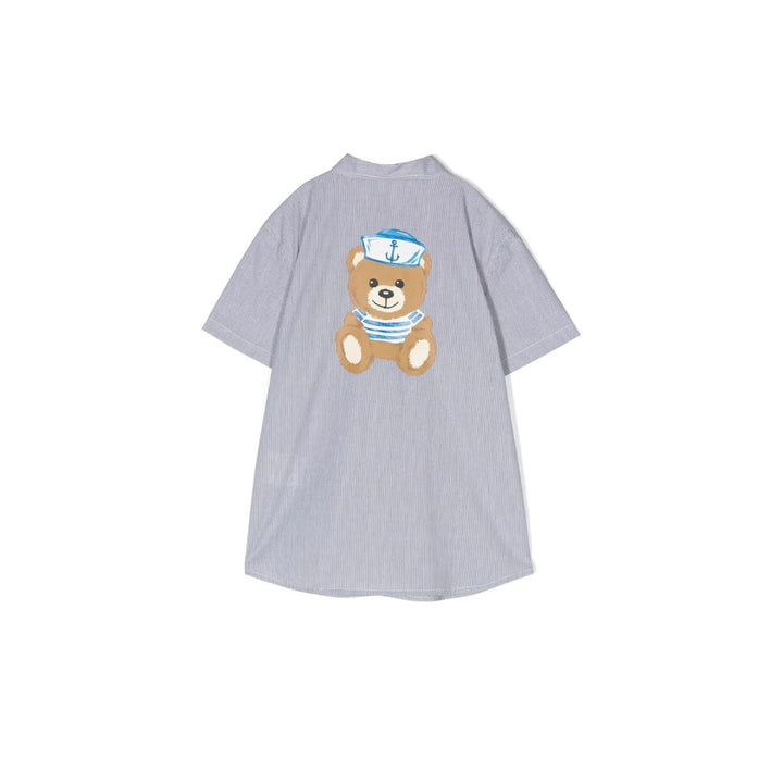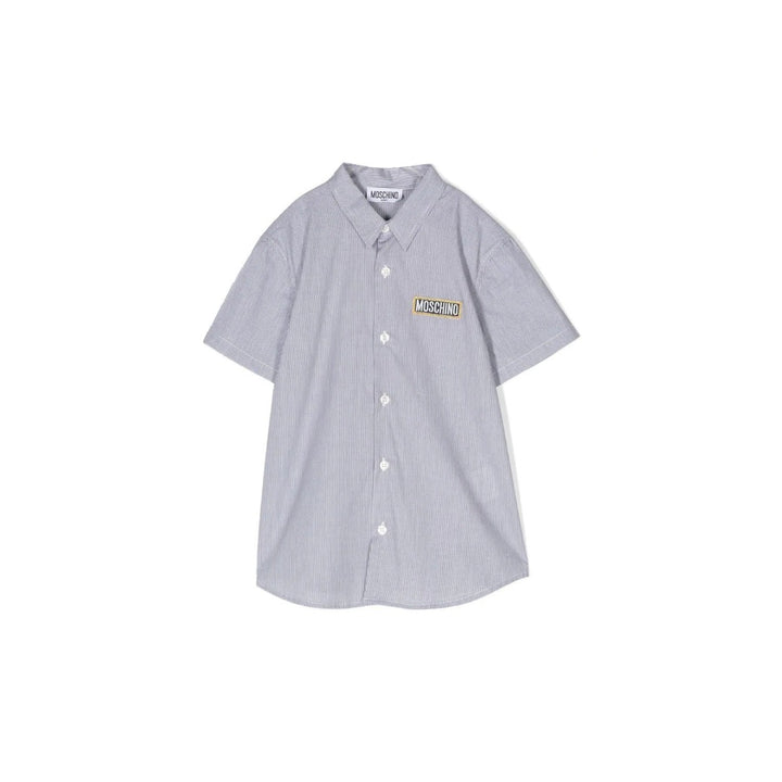 Boys striped logo-patch shirt from MOSCHINO KIDS featuring navy blue, white, stretch-cotton, stripe print, logo patch to the front, classic collar, front button fastening, short sleeves and straight hem.