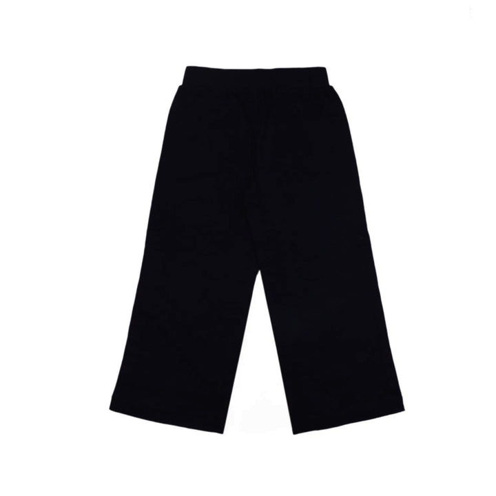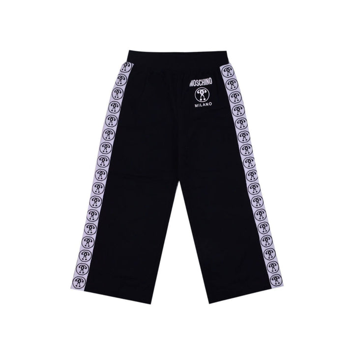 Black Mini-me joggers for boys and girls from Moschino Kid-Teen, with convenient side pockets. Made in soft, stretchy and mid-weight jersey, the fabric has a fleecy-feel underside for added cosiness. The waistband is elasticated with inner drawstrings to ensure a comfortable fit on little tummies. Double Question Mark logo tape can be found on the sides and a black logo graphic is stamped on the front to complete the look.