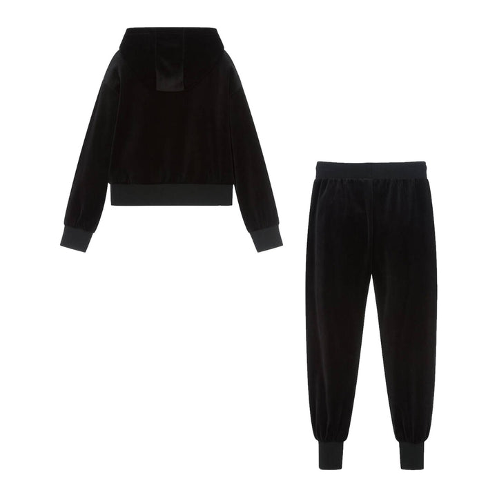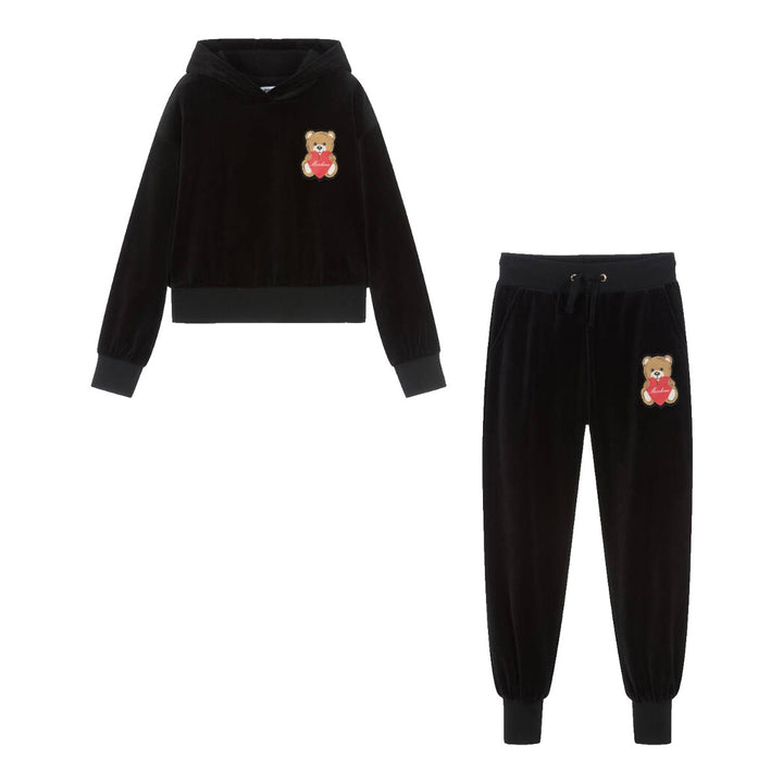Girls black tracksuit by Italian label Moschino Kid-Teen, characterised by signature Moschino Teddy Bears and heart logo appliques. Made in super soft cotton velour, the slightly cropped hoodie is designed to sit on the waist for a modern look. The matching joggers have an adjustable drawstring waist and snug ribbed cuffs. The front pockets provide a space for small, everyday essentials.