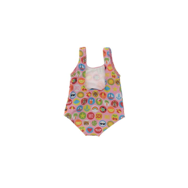 Girls graphic-print U-neck swimsuit from MOSCHINO KIDS featuring white/multicolour, all-over graphic print, metallic threading, U-neck and sleeveless. Be mindful to try on swimwear over your own garments..