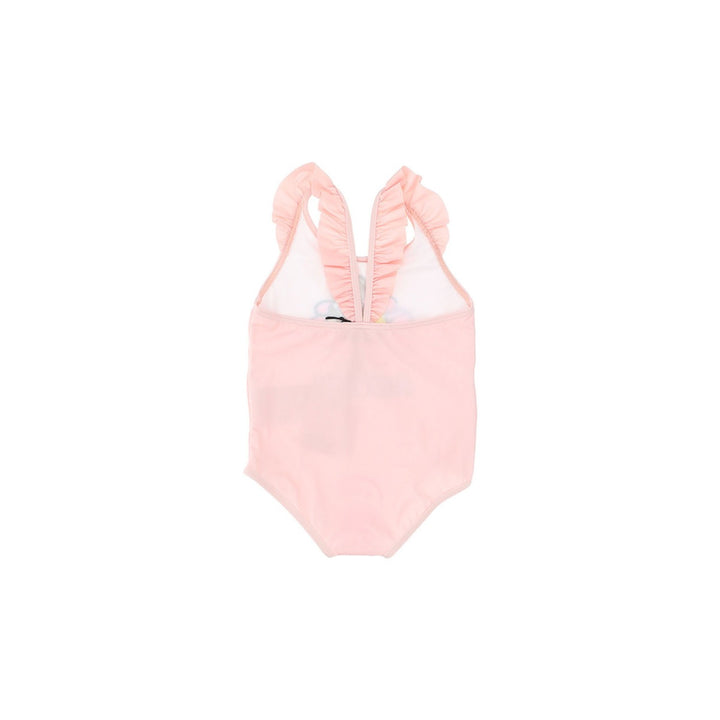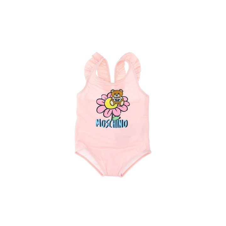 Orange swimsuit for little girls by Italian brand Moschino Baby, with a full lining and a silky soft exterior. Bright and coloruful, it has the brands iconic Teddy Bear logo with a pretty flower printed on the front and ruffle-trimmed shoulder straps.