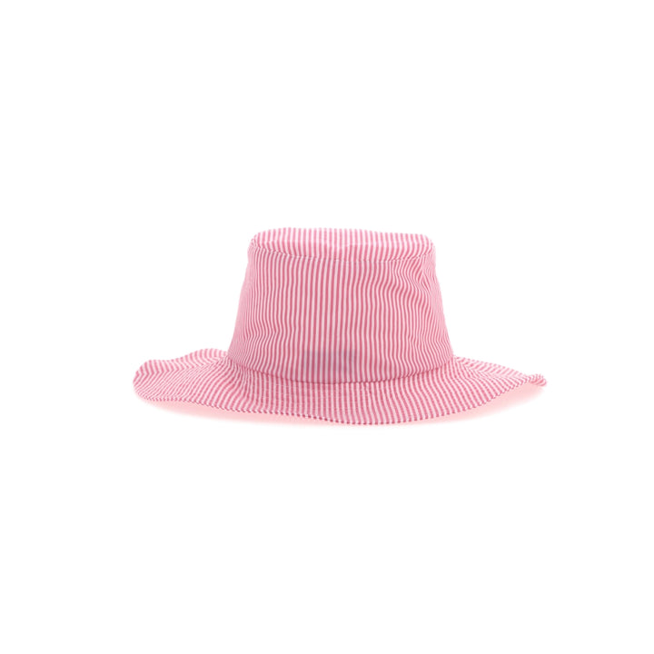 Girls stripe-print cotton hat from MOSCHINO KIDS featuring light pink, white, cotton blend, stripe print, embroidered logo, wide brim, oval crown and slip-on style.