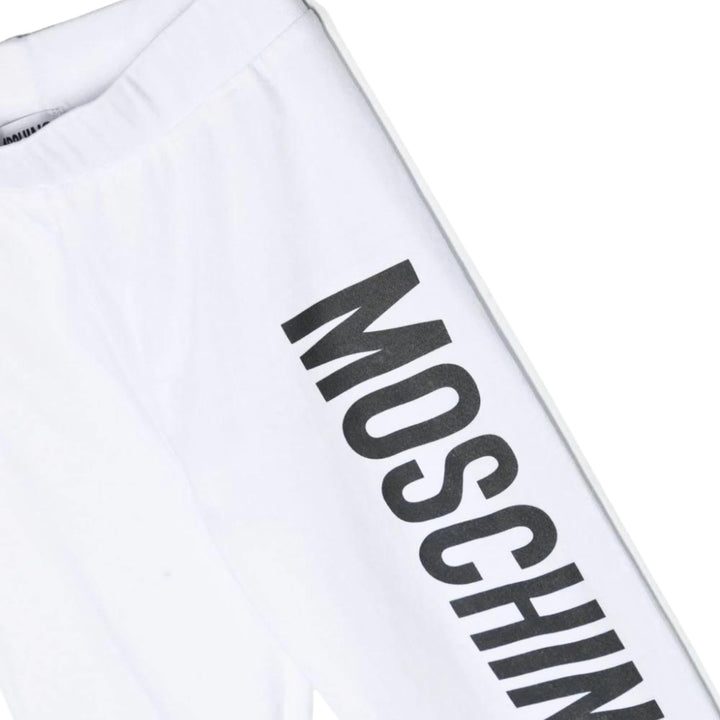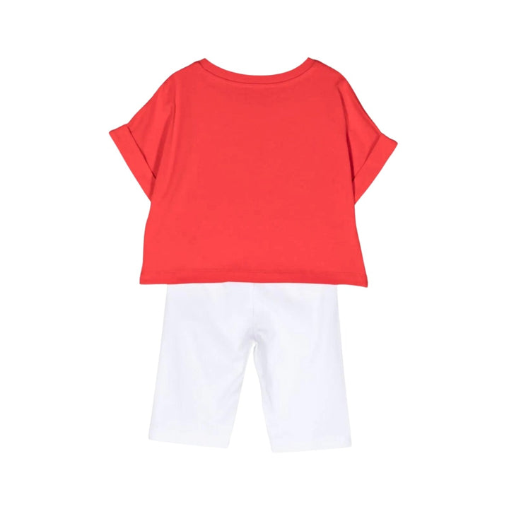 Red top and white shorts set for girls, unmistakably by luxury Italian brand Moschino Kid-Teen. Both pieces are printed with the designer's name in bold letters, with their iconic Moschino Teddy Bear featured on the front of the top. Made in comfortable cotton jersey, the T-shirt is in a relaxed boxy fit and the cycle shorts have a gently elasticated waist.