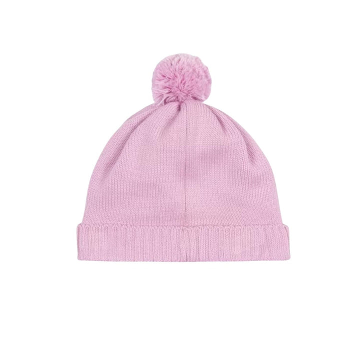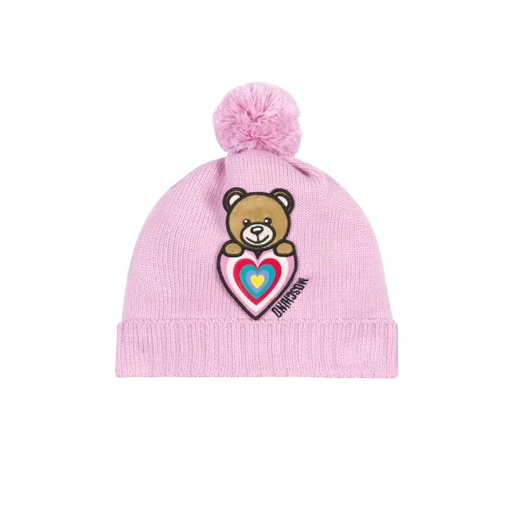 Pink hat for girls by Moschino Kid-Teen, knitted in a soft, wool blend. This double layer hat has a warm fleece lining and the signature Moschino Teddy Bear on the front with a black embroidered logo underneath. There is a large pom-pom on the top and a ribbed, turned-up brim.