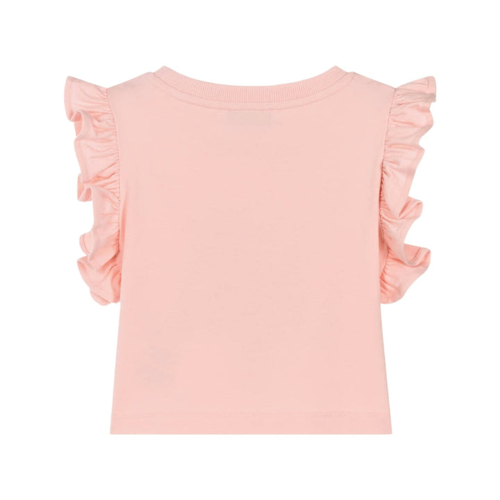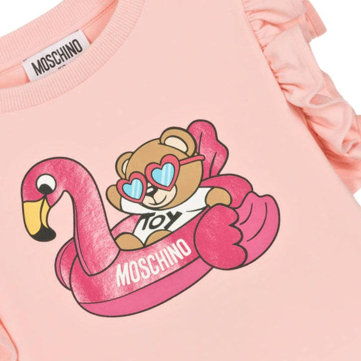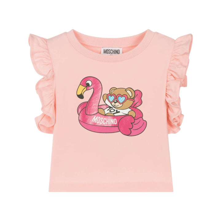 Pink marl cotton Top for girls, unmistakably by luxury Italian brand Moschino Baby. The iconic Moschino Teddy Bear is printed on the front of both pieces, climbing the designer's bold, black logo. The Top is made in soft, comfortable jersey and fastens with poppers on the back. The matching hat is lined for comfort.