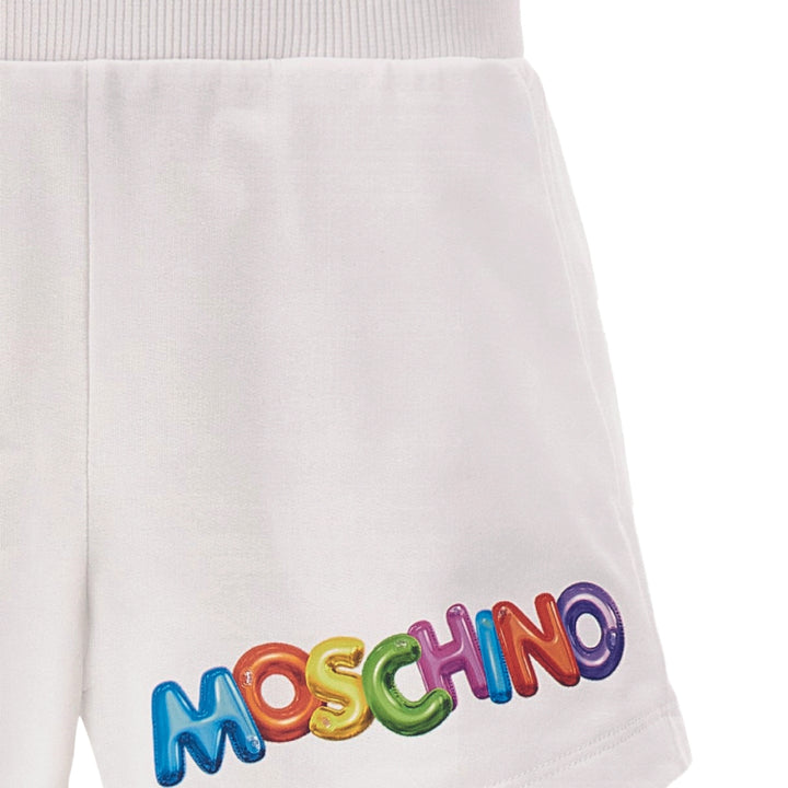 White logo-print stretch-cotton shorts from MOSCHINO KIDS featuring multicolour, stretch-cotton, logo print at the leg, elasticated waistband and two side slit pockets.