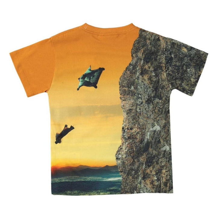 Graphic print T-shirt for boys by Molo, showing a rock climber against a golden yellow and orange sunset. It is made in soft and comfortable organic cotton jersey, with brand's black logo label sewn near the hem.