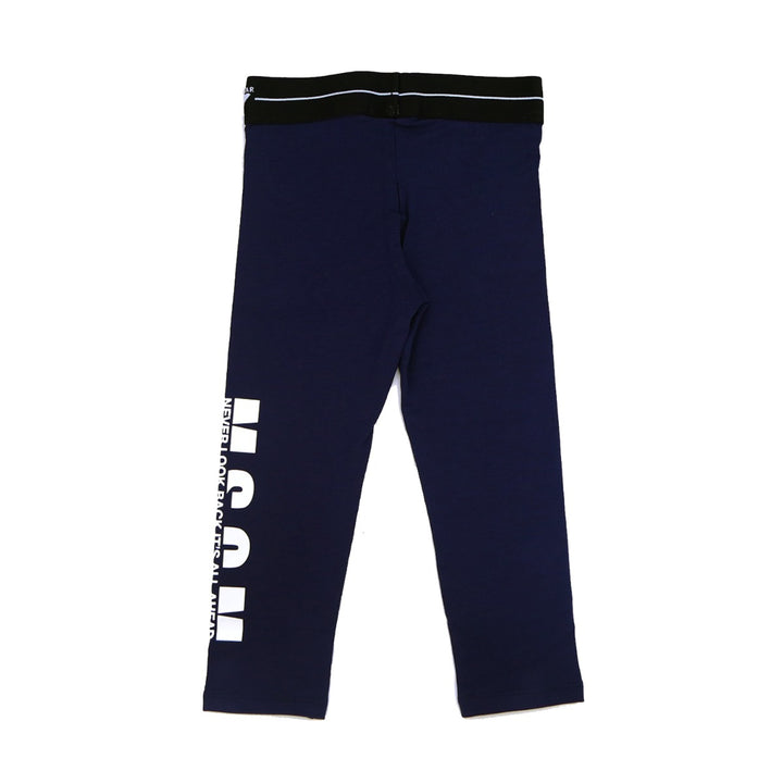 Girls blue cotton jersey leggings by MSGM, with a wide, elasticated waistband and white logo detail. The words 'NEVER LOOK BACK' are printed in white on one leg, along with a rubberised logo print