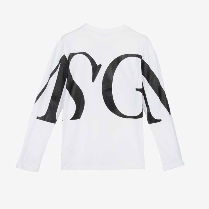 White top for boys by MSGM, with a blue flocked logo on the front. Made in comfortable cotton jersey, it has a large black logo on the back and sleeves.