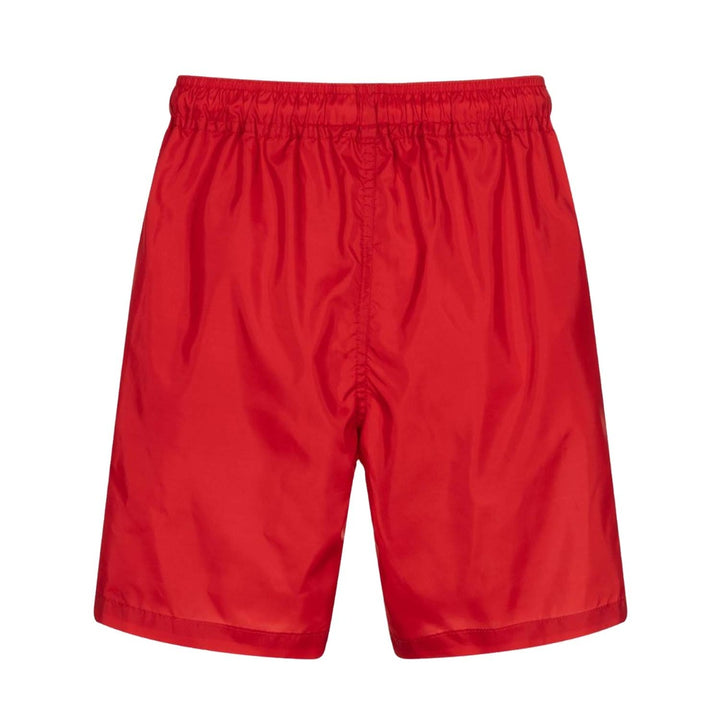 Red swim shorts for teen boys by MSGM, made in soft and silky polyester. There is an oversized logo print across the legs in white and useful concealed side pockets. They have a soft mesh pants lining for comfort and an elasticated, drawstring waistband.