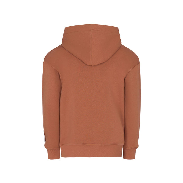 Dark beige hooded sweatshirt for boys by MSGM, made in comfortable cotton jersey with a cosy fleece feel inside. For a stylish designer touch, it has an angular flocked red logo on the chest and an embroidered logo patch on one sleeve. It is finished with a front pouch pocket and ribbed trims to complete the casual look.