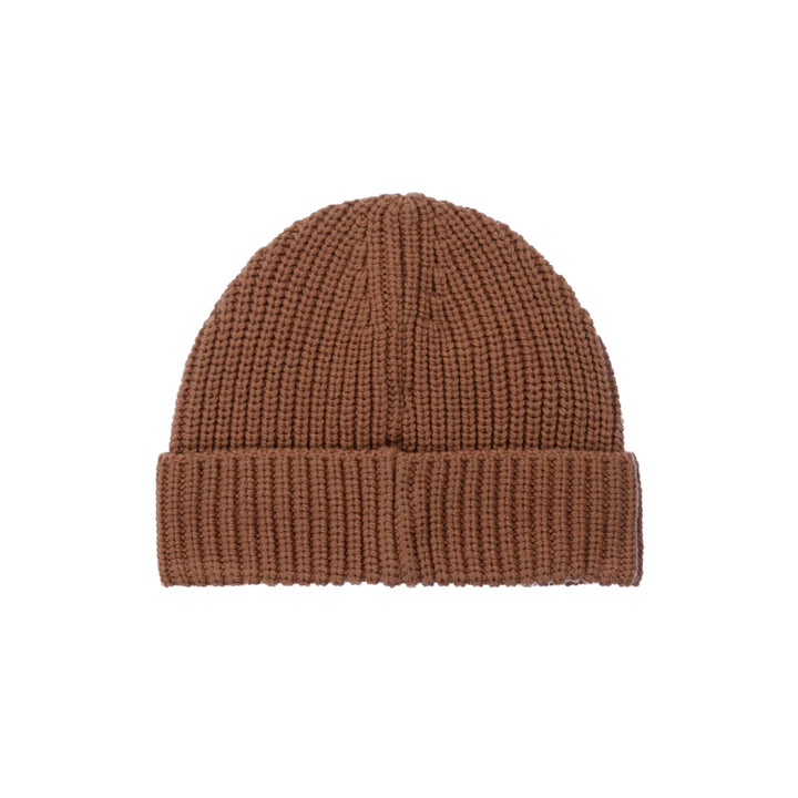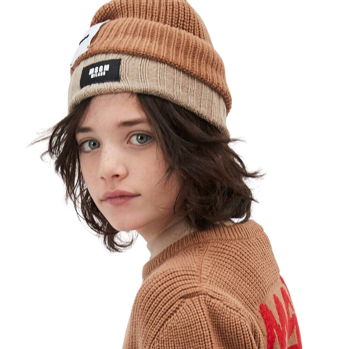 Tan brown beanie hat for boys by Italian brand MSGM, knitted in a super soft virgin wool blend. It can be paired with any outfit for an instantly cool upgrade. The turned-up brim has an ivory logo badge stitched on the front for a branded sign-off.