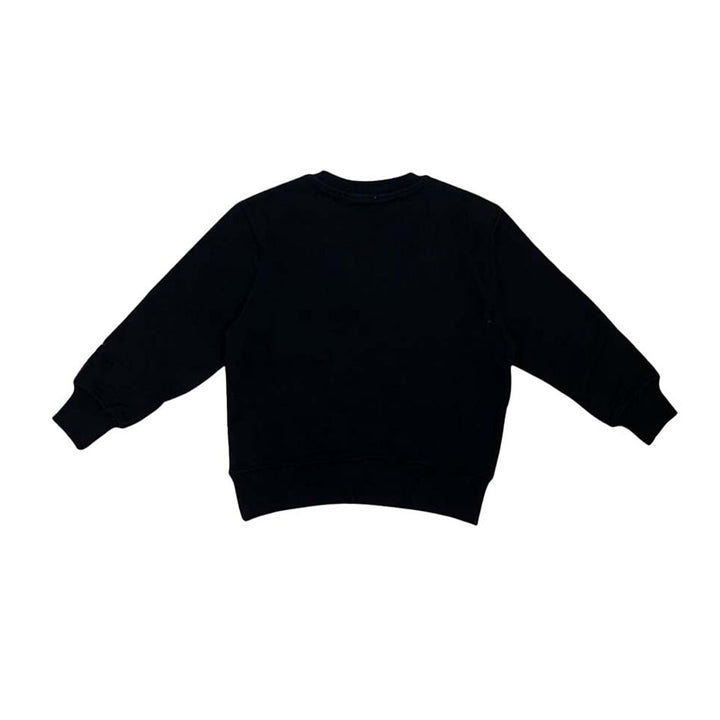 Black cotton sweatshirt for boys by Italian brand MSGM, with the designers colourful paint logo printed on the front and a New Attitude statement below. Made in stretchy, mid-weight jersey with a cosy, fleecy inside, it has a relaxed, drop-shouldered fit and is ideal for everyday comfort. There is a black, triangular logo patch above one cuff for extra designer recognition.