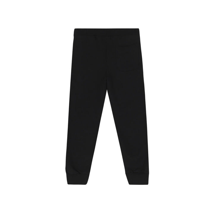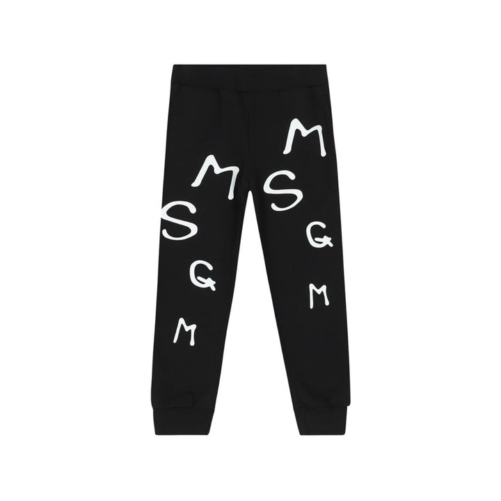 Black logo joggers for boys by MSGM. Made from soft cotton, it features the brands logo print in white on the front. It has dual side pockets and single pocket at the back. An elasticated waistband for comfortable fit.