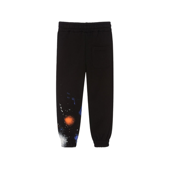Black statement joggers for boys by MSGM, made in mid-weight cotton jersey. Stylish and contemporary, these fun bottoms have a colourful paint splash print on one leg. There is a white logo print on the front, along with handy jetted pockets, ideal for storing belongings.