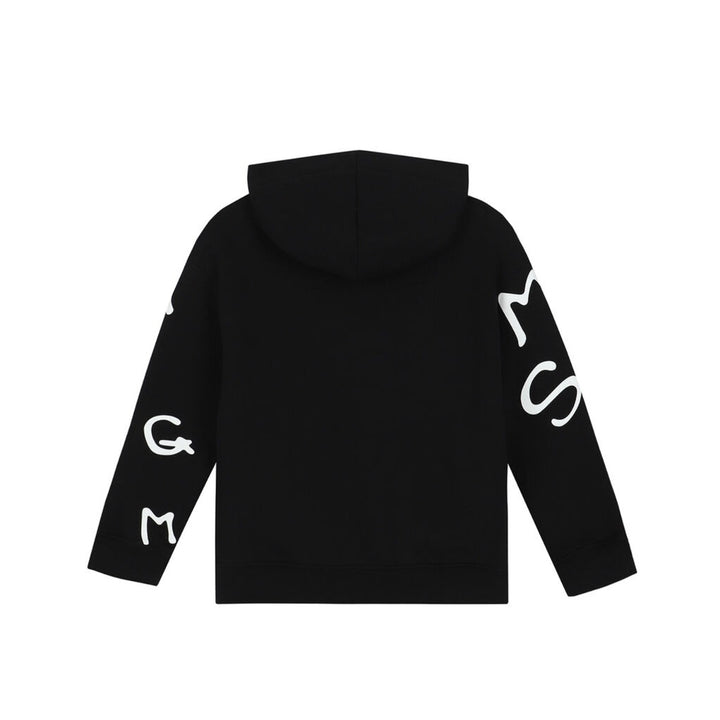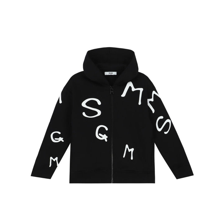 Black logo zip up top for boys by MSGM. Made from soft cotton, it features the brands logo print in white on the front and sleeves. Hoodie neck and long sleeve with ribbed cuff and hem. It fastens with zip on the front.