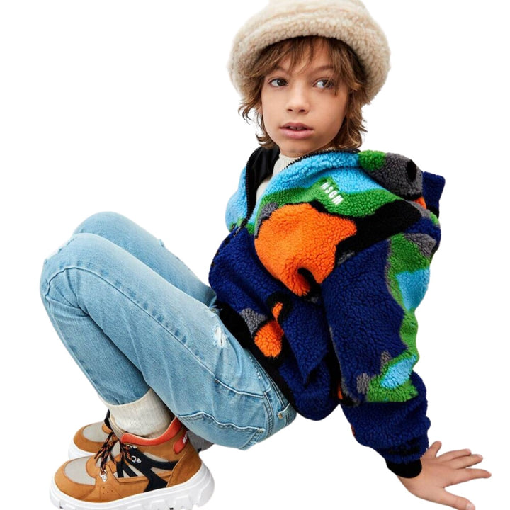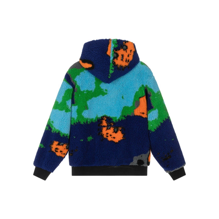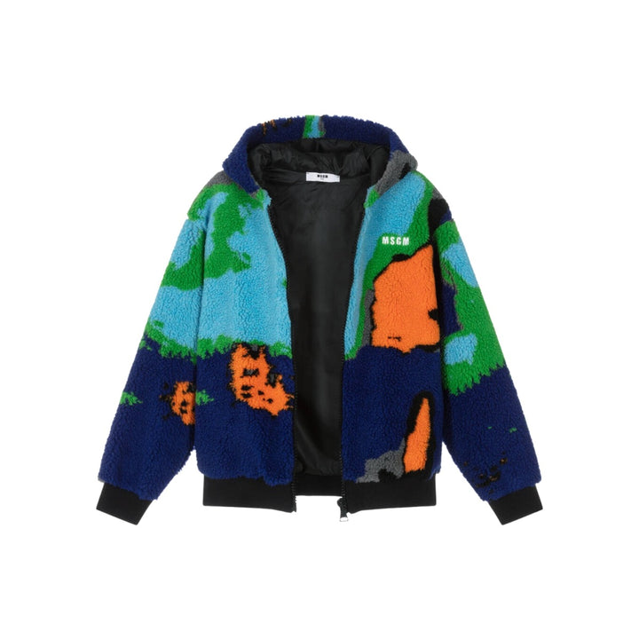 Hooded zip-up Jacket for boys by MSGM, with a colourful melted paint pattern in shades of blue, green and orange. Made in cosy sherpa fleece with a satin lining, it has useful concealed side pockets and soft ribbed trims.