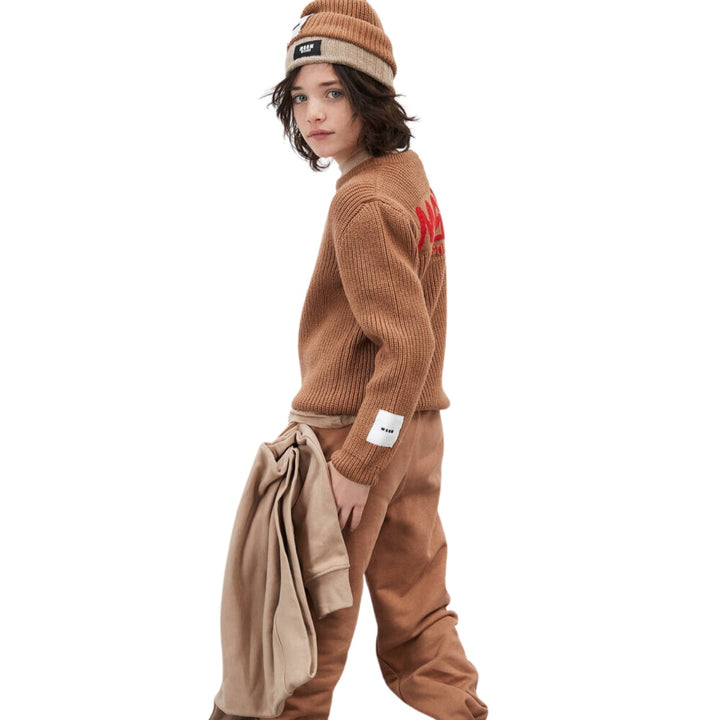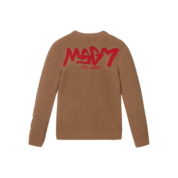 Brown wool-blend jumper for boys from Italian brand MSGM. This cosy ribbed crew-neck design is patterned with a red logo on the back and has an embroidered logo patch on one sleeve for instant designer appeal.