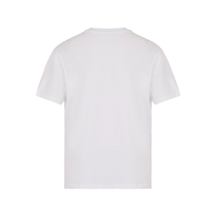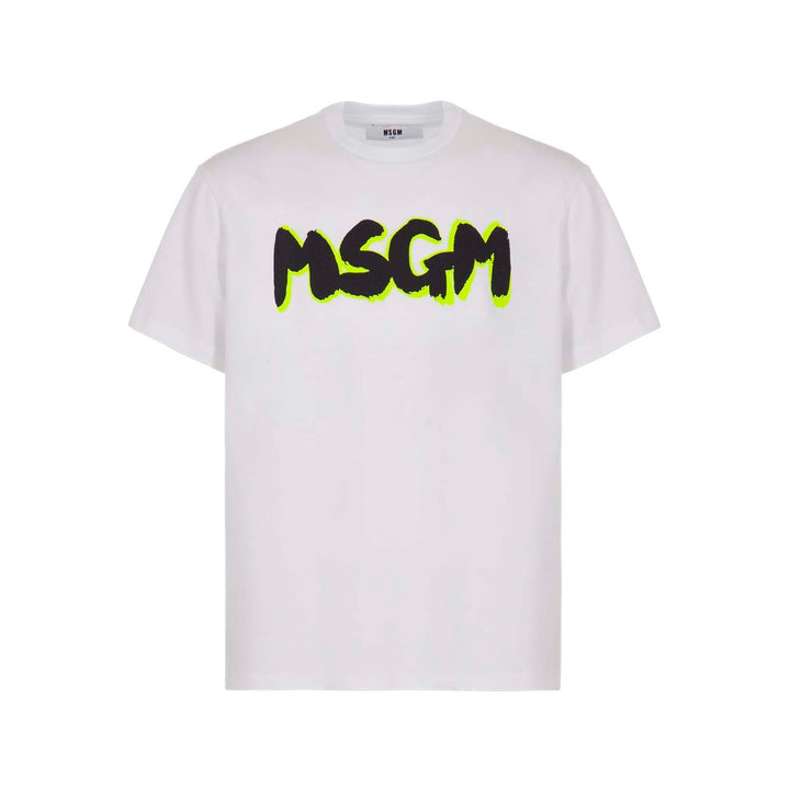 Cool white cotton crew-neck T-shirt for boys by Italian brand MSGM. This short-sleeved jersey tee has a brushed logo graphic in black and bright yellow for a bold streetwear look.