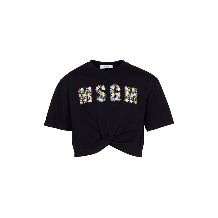 Girls black T-shirt by MSGM with a knotted front and colourful logo. Made in soft cotton jersey, this feminine top is decorated with floral-shaped sequins and beads for a sparkly effect.